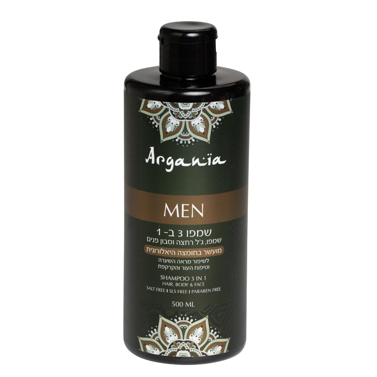 שמפו 3 ב 1 לגבר: שמפו, ג`ל רחצה וסבון פנים, ייחודי לגבר מבית ARGANIA למראה מטופח ותחושת רעננות.